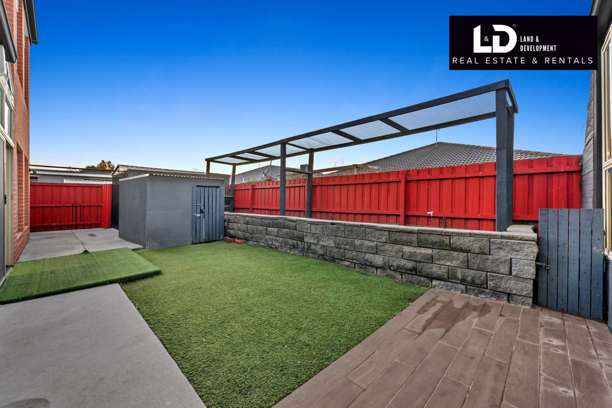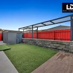 The low-maintenance backyard features artificial grass, providing a neat and green space without the need for regular upkeep. It’s perfect for children or pets to play in.