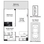 The spacious bedroom includes built-in robes and balcony access, while the modern bathroom and European laundry add to the apartment’s smart design. Additional features include split-system air conditioning, double-glazed windows, and a secure car space.